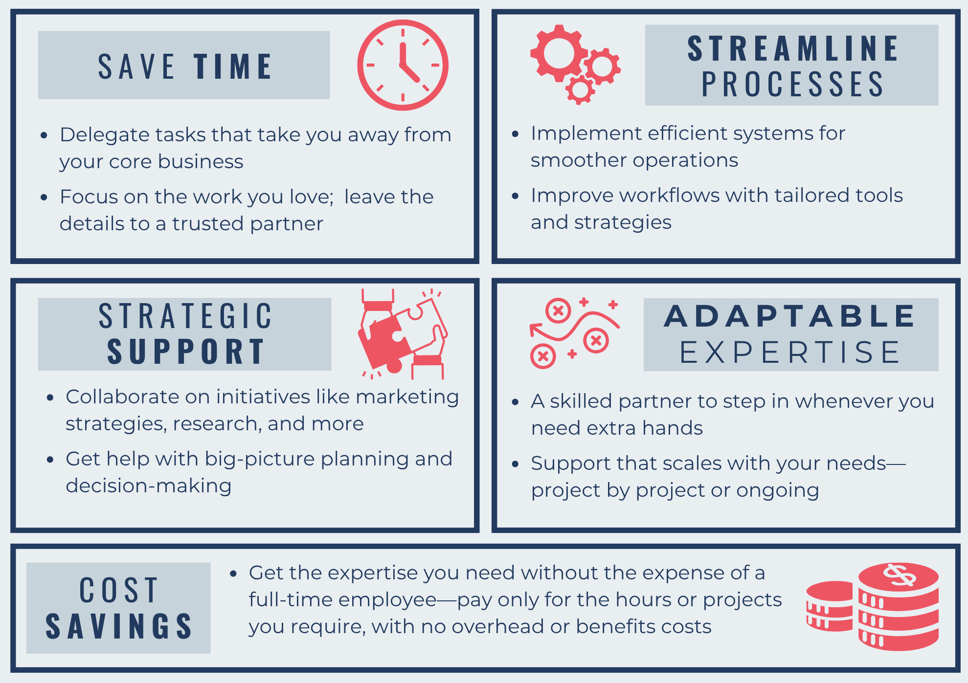 From one-off sessions to long-term support, I help small businesses get organized, take action, and actually move forward.